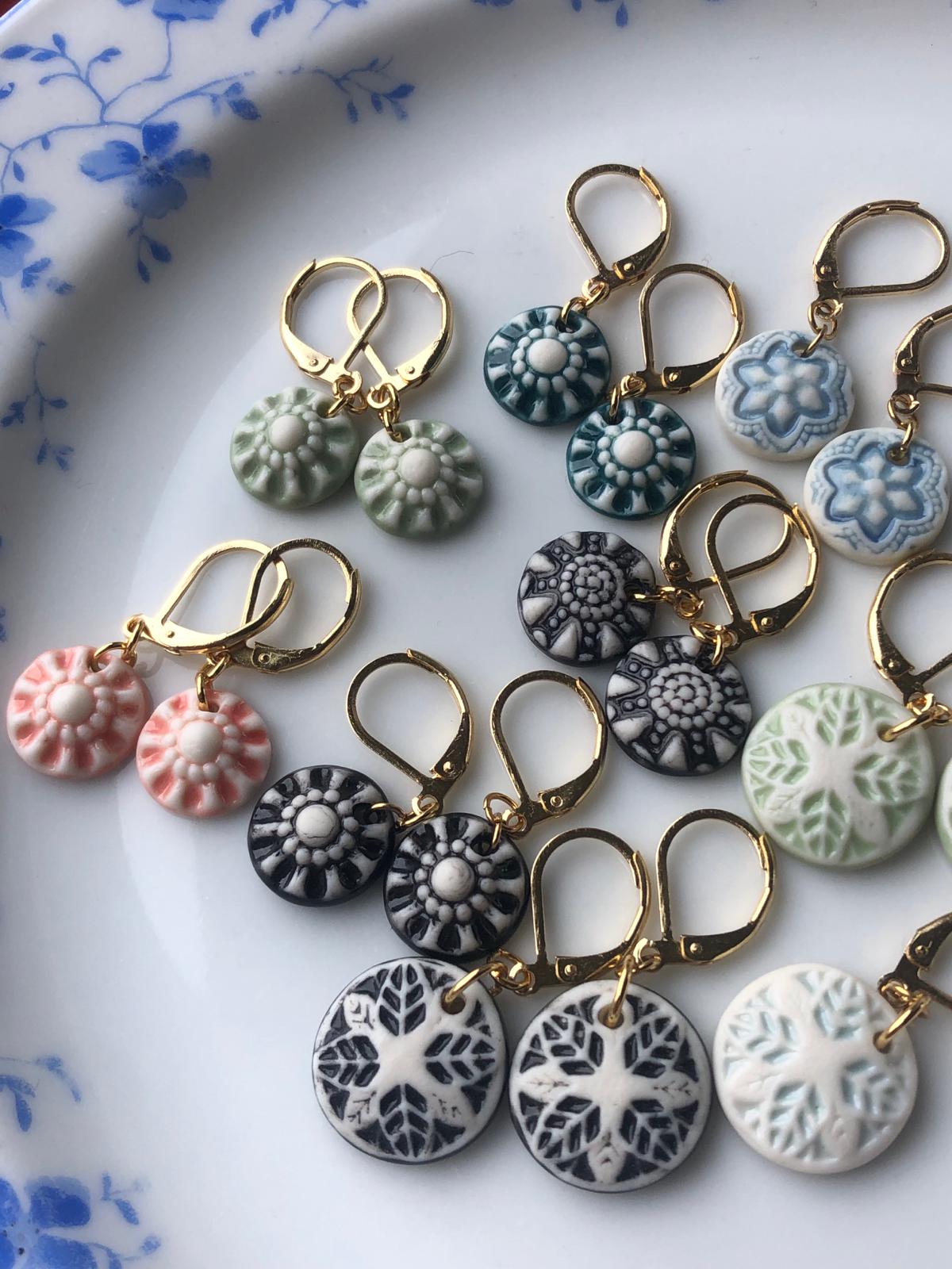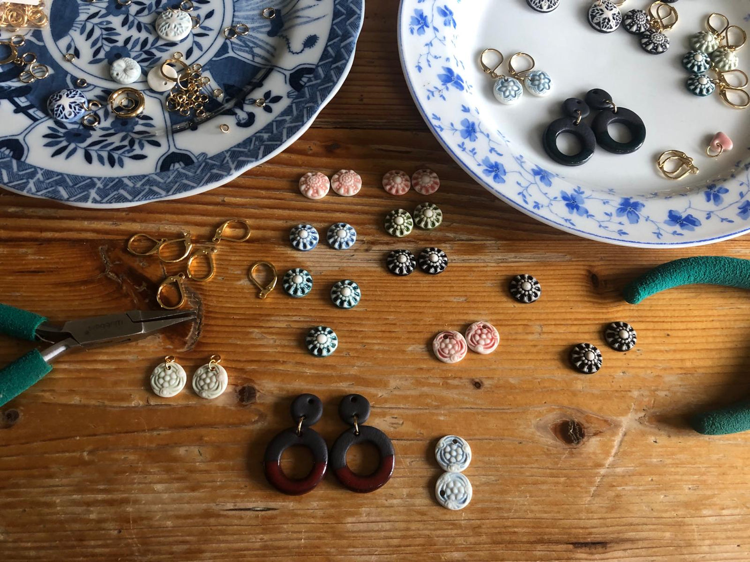Mijn sieraden worden met de hand gemaakt door kleine stukjes porseleinklei om te vormen door te boetseren, snijden of met een drukmal te werken.